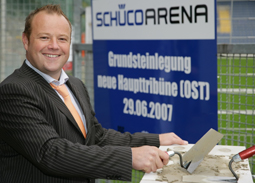 Von der Idee bis zum Baubeginn Schon im Jahr 2003 entwickelte Ulrich Möntmann die Idee zum Endausbau der SchücoArena. Auch angetrieben durch die Entwicklung der neuen WM-Stadien mit dem daraus resultierenden Wettbewerbsnachteil für Arminia Bielefeld ergab sich schnell das Konzept. Den vermeintlichen Nachteil eines innerstädtischen Stadions durch die Nachfrage auf außergewöhnliche Büroflächen positiv wandeln und den ohnehin umbauten Raum einer klassischen Tribüne für diese Flächen nutzen. Im Dach die Sky Offices, in der Zwischenebene die VIP-Offices. Gleichzeitig mit der neuen Arena den Anforderungen der Zuschauer mit neuen Premium- Logen und zeitgemäßen VIP-Räumlichkeiten gerecht zu werden und im Bundesligavergleich wettbewerbsfähig zu bleiben, auch finanzielle Freiheiten zu erlangen um ggf. sportlich besser investieren zu können. Auf dieser Grundlage entstanden im Juli 2004 im Brainstorming erste Skizzen, die 2005 einen Vorplanungsstatus erreichten. Ein Gespräch bei der Bauverwaltung fand positiven Anklang, nicht ohne den Hinweis auf die komplizierte Rechtslage und das Genehmigungsverfahren. Die Geschäftsführung erkannte sofort die Chancen für Arminia und kurze Zeit später erfolgte das grüne Licht auch durch den Vorstand, den Aufsichtsrat und den Verwaltungsrat. Ob der sensiblen Anwohnersituation entwickelte Möntmann Immobilien mit dem Verein hinter verschlossenen Türen fleißig weiter. Im März 2006 dann die erste öffentliche Pressekonferenz mit der Hoffnung auf einen schnellen Baubeginn. Die Anwohnerproblematik musste aber erst in einem schwierigen Mediationsverfahren beim Verwaltungsgericht Minden gelöst werden. Dank großem Verhandlungsgeschick unseres Präsidenten Hans-Hermann Schwick, Geschäftsführer Roland Kentsch und dem entgegenkommen der Anwohner konnte ein für beide Seiten verträglicher Kompromiss gefunden werden. Die nötigen Genehmigungen sind erteilt und die Grundsteinlegung am 29.06.07 war der Startschuss zum Baubeginn. Mit der Fertigstellung ist Arminia einen großen Schritt in der Wettbewerbsfähigkeit weiter und die Stadt um ein spektakuläres Geschäfts- / Tribünengebäude reicher ! Auf geht´s Arminia !! |